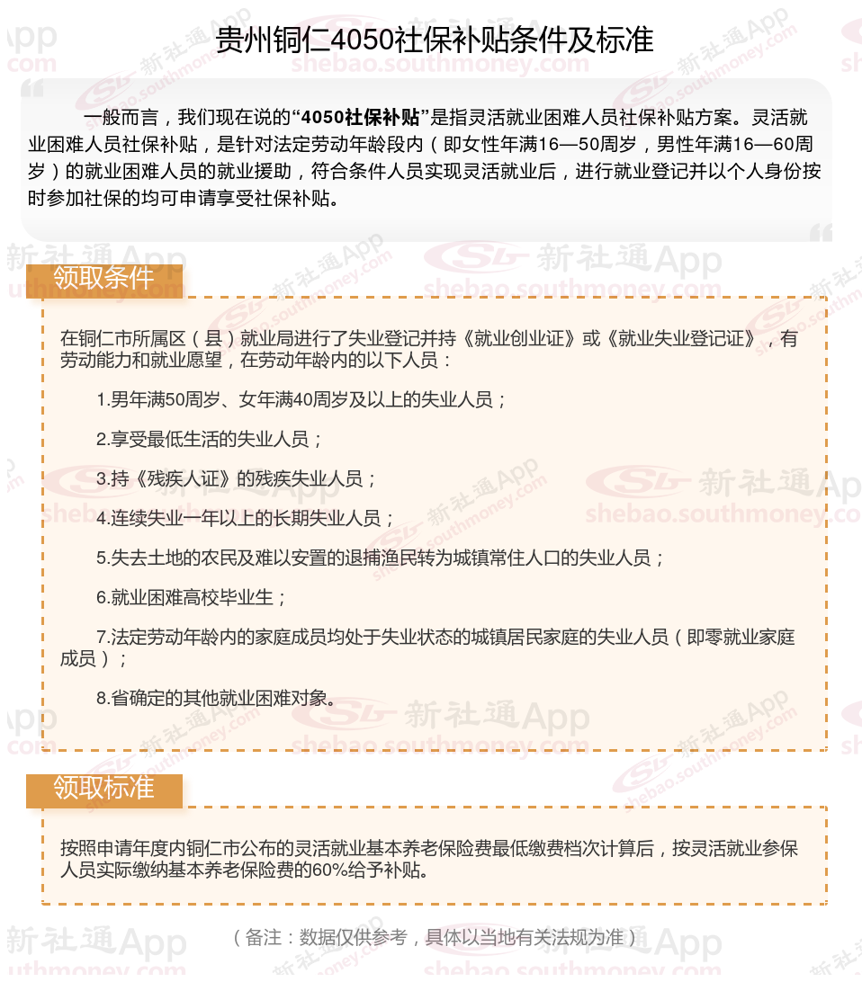 2024贵州铜仁灵活就业4050社保补贴是一项面向特定年龄段的就业困难人群的社会保险补贴。