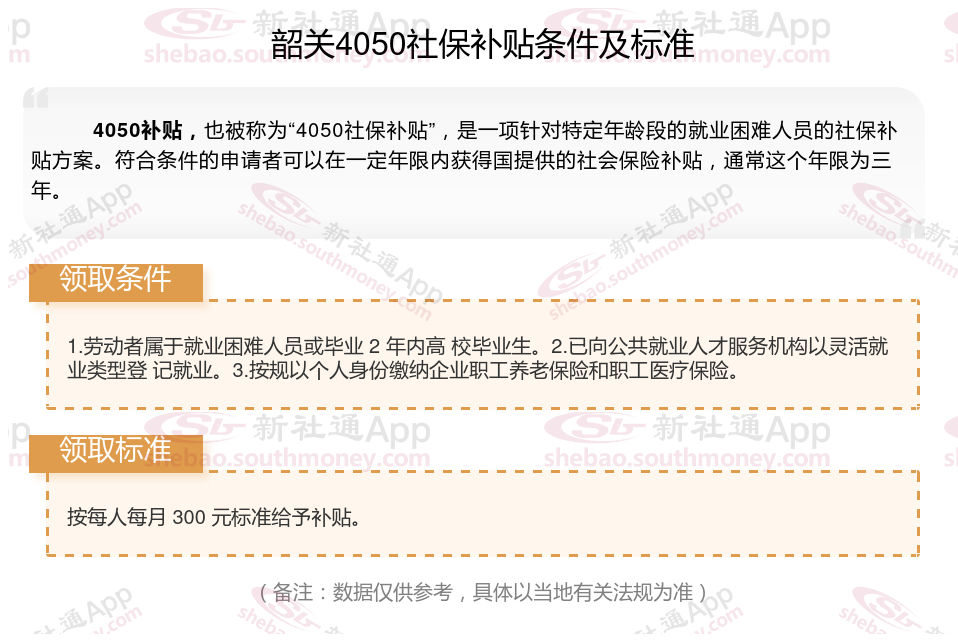 2024韶关4050补贴主要针对的是年龄在40岁以上的女性和50岁以上的男性,这些人群通常因为年龄较大而面临就业困难。