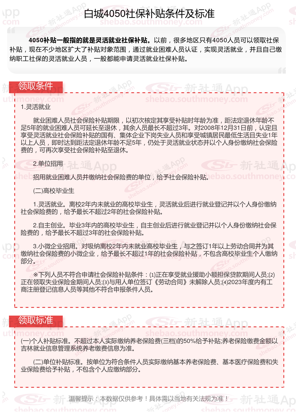 2024白城4050补贴主要针对的是年龄在40岁以上的女性和50岁以上的男性,这些人群通常因为年龄较大而面临就业困难。