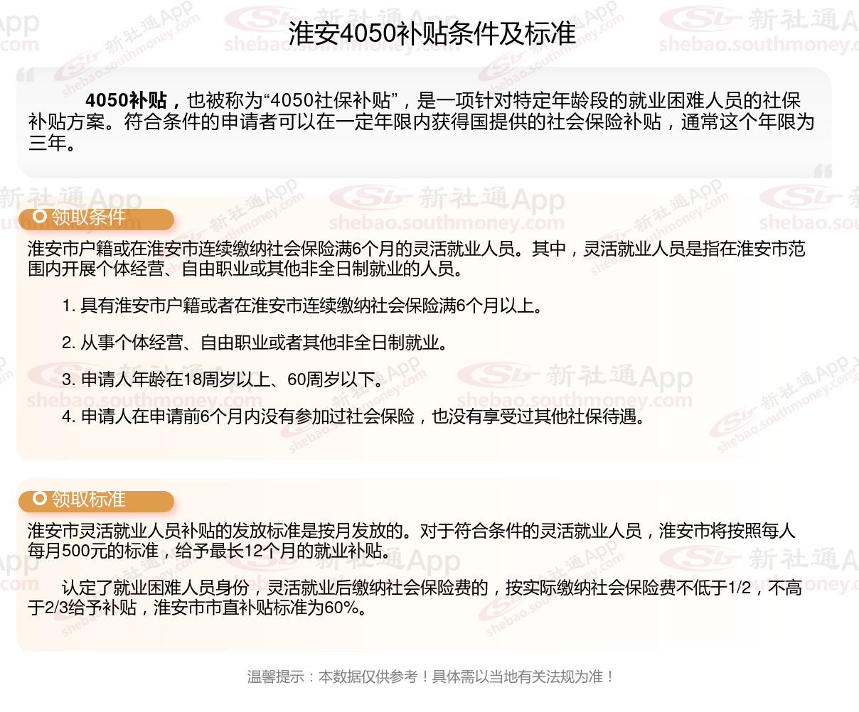 2024淮安4050补贴主要针对的是年龄在40岁以上的女性和50岁以上的男性,这些人群通常因为年龄较大而面临就业困难。