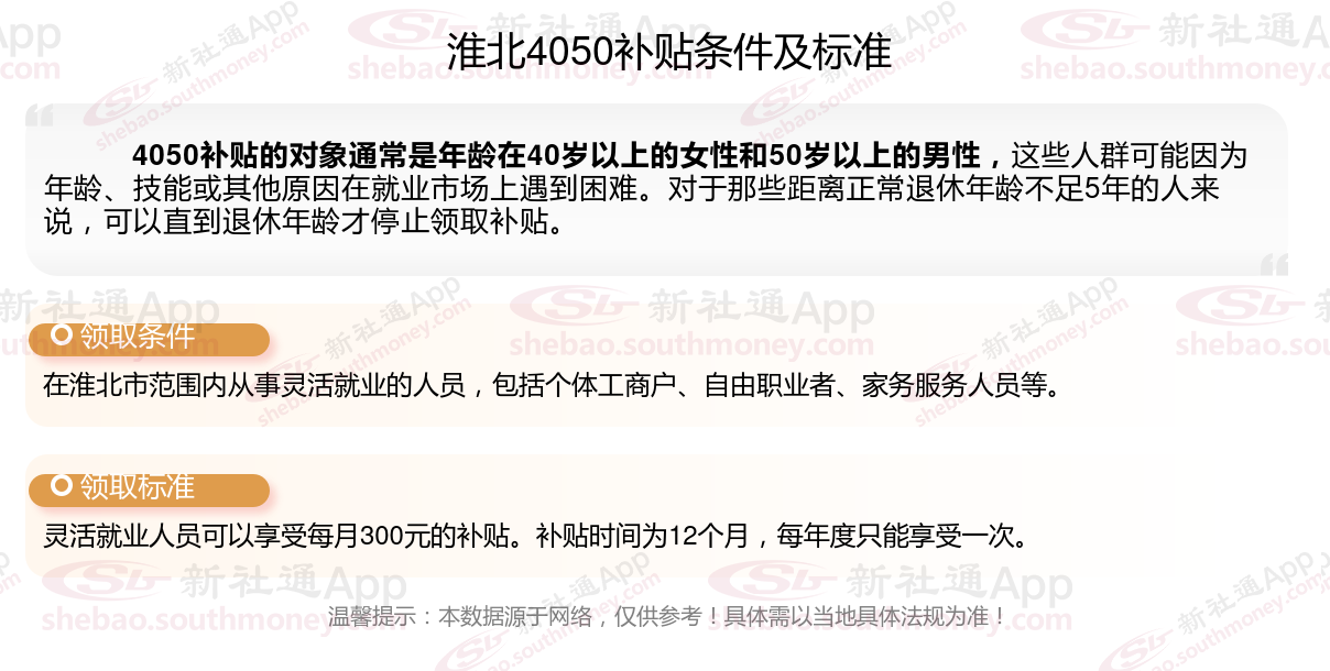 2024淮北4050补贴主要针对的是年龄在40岁以上的女性和50岁以上的男性,这些人群通常因为年龄较大而面临就业困难。