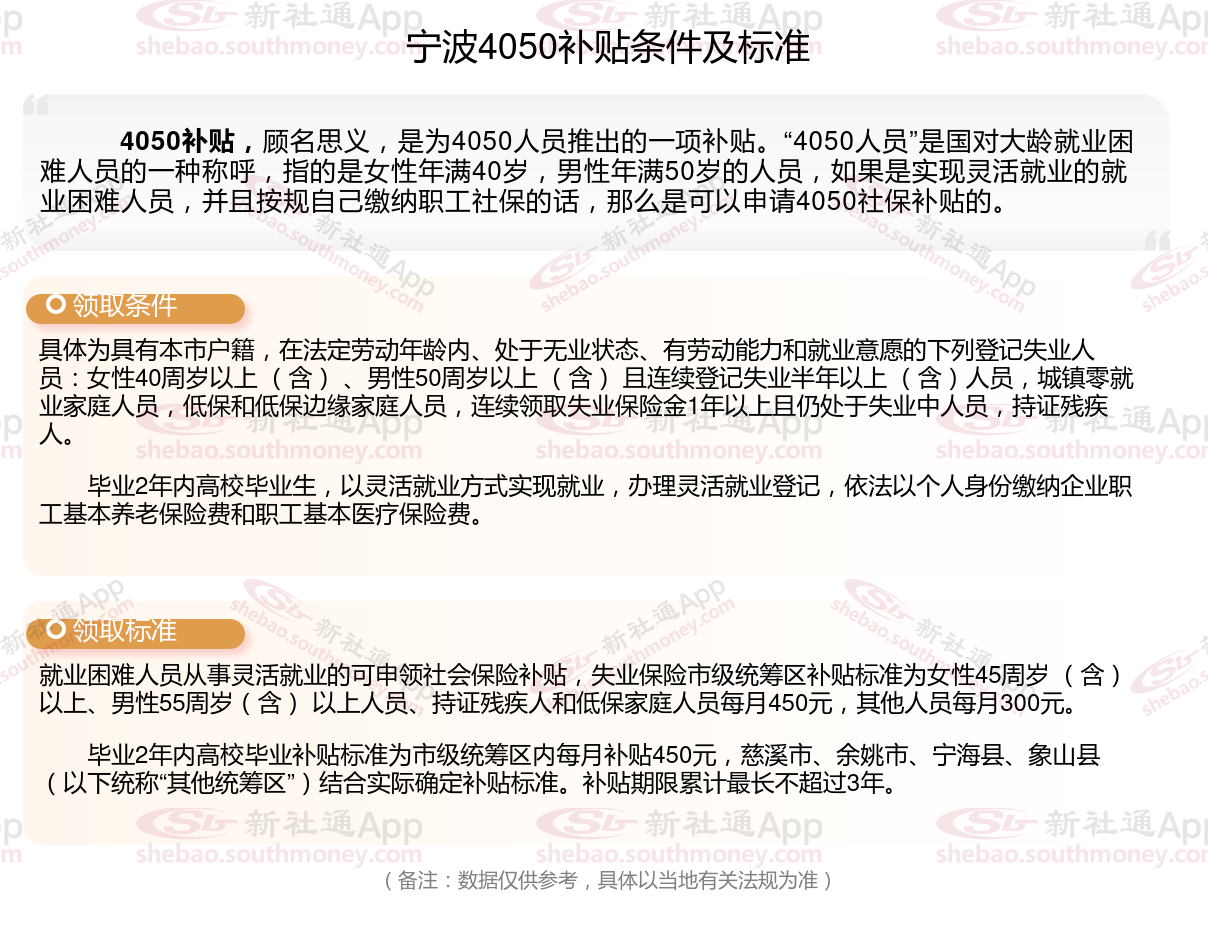 “4050人员”是国对大龄就业困难人员的一种称呼,指的是女性年满40岁,男性年满50岁的人员,那么宁波4050灵活就业社保补贴标准是多少钱?宁波4050社保补贴条件是什么?接下来随新社通APP小编了解一下最新资讯。