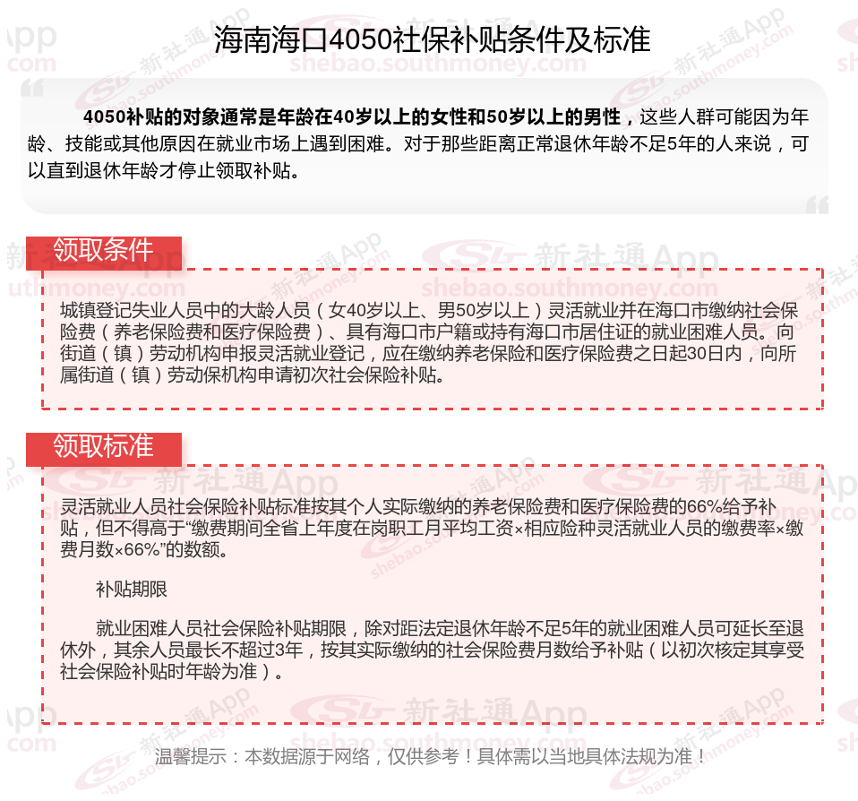二、海南海口4050社保补贴标准及条件2023-2024年,最新如下