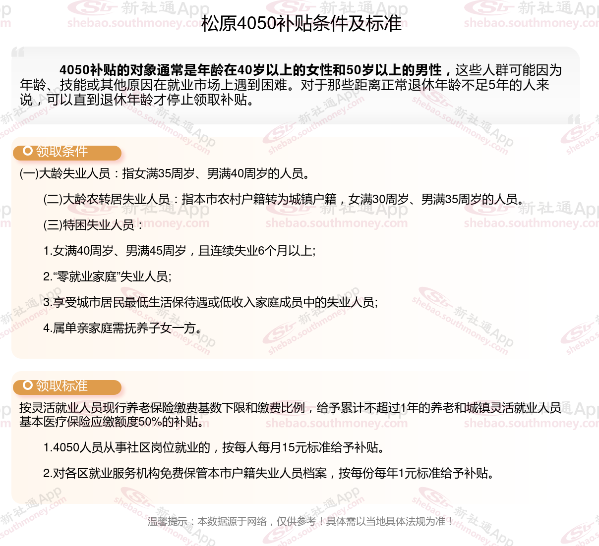 2024松原4050补贴主要针对的是年龄在40岁以上的女性和50岁以上的男性,这些人群通常因为年龄较大而面临就业困难。