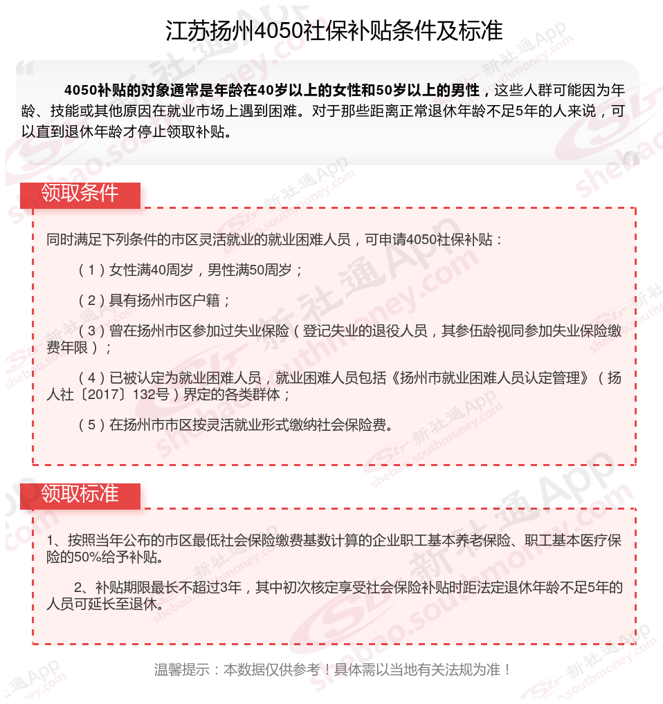 二、江苏扬州4050社保补贴标准及条件2023-2024年,最新如下