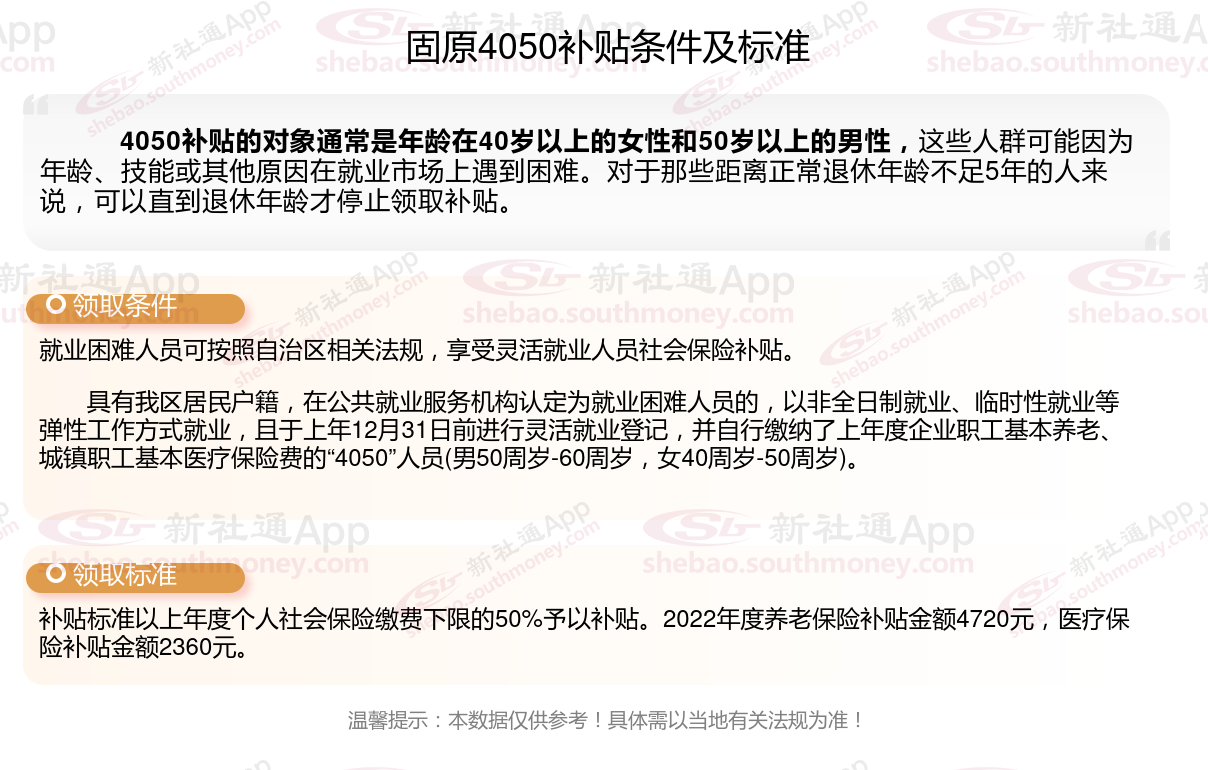 一、固原4050社保补贴标准及条件2023-2024年