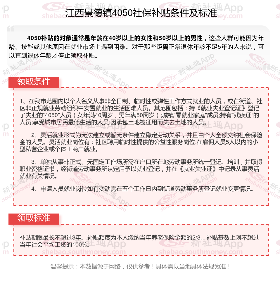 2024江西景德镇4050补贴主要针对的是年龄在40岁以上的女性和50岁以上的男性,这些人群通常因为年龄较大而面临就业困难。