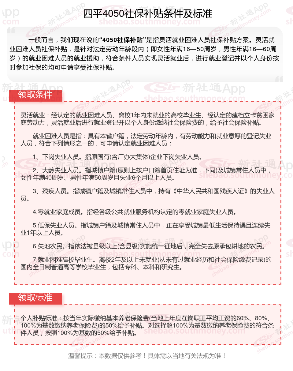 2024四平灵活就业4050社保补贴是一项面向特定年龄段的就业困难人群的社会保险补贴。