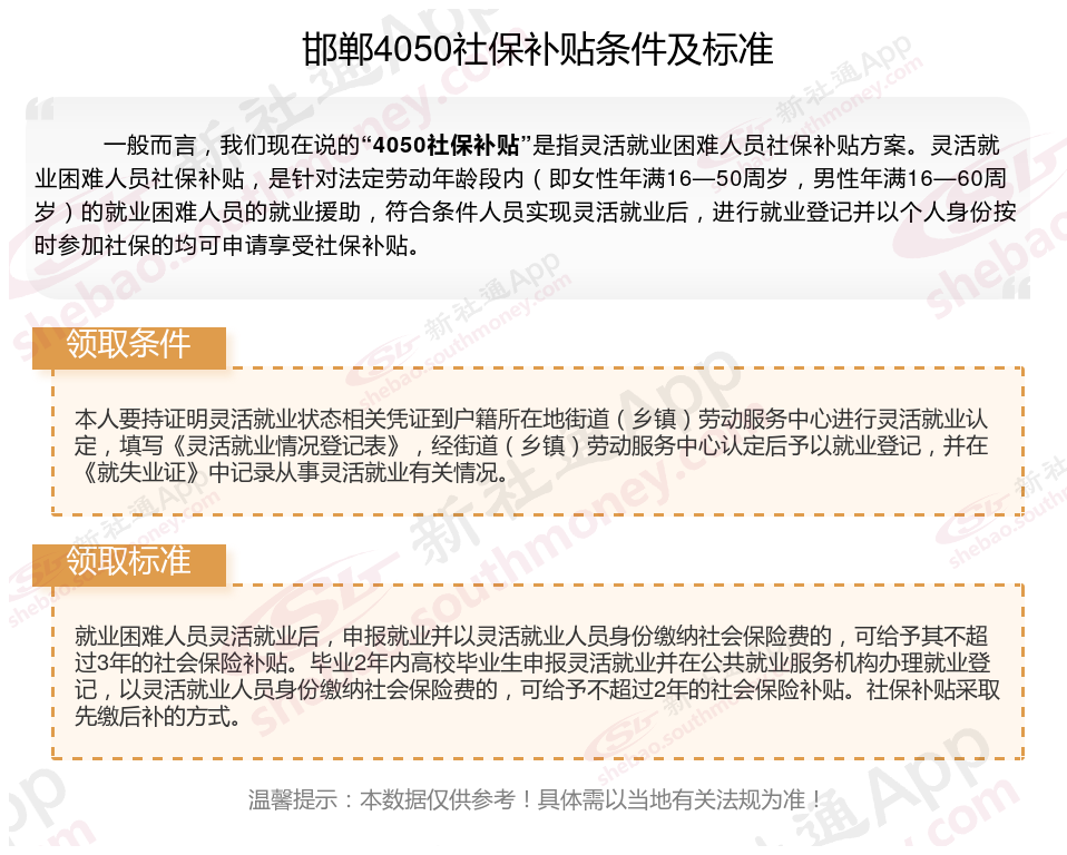 二、邯郸4050社保补贴标准及条件2023-2024年,最新如下