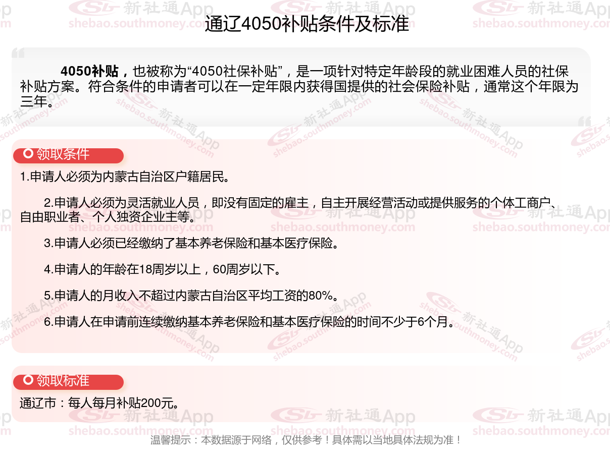 “4050人员”是国对大龄就业困难人员的一种称呼,指的是女性年满40岁,男性年满50岁的人员,那么通辽4050灵活就业社保补贴标准是多少钱?通辽4050社保补贴条件是什么?接下来随新社通APP小编了解一下最新资讯。