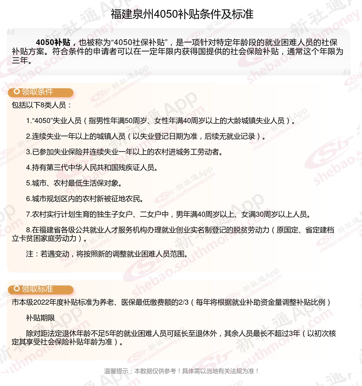 一、福建泉州4050社保补贴标准及条件2023-2024年