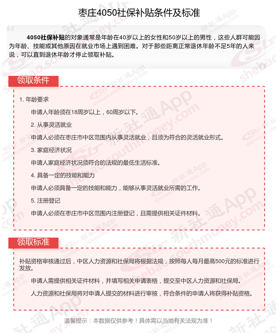 二、枣庄4050社保补贴标准及条件2023-2024年,最新如下