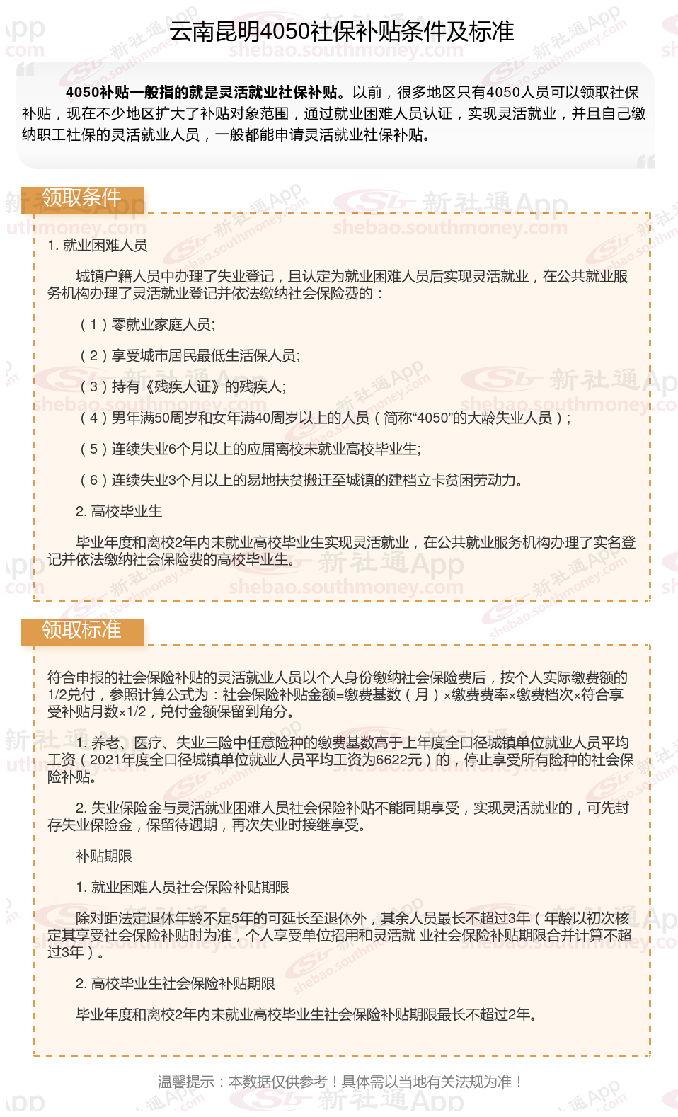 多数地区只有4050人员可以领取社保补贴,现在扩大了补贴对象及范围,通过就业困难人员认证,实现灵活就业,并且自己缴纳职工社保的灵活就业人员,一般都能申请灵活就业社保补贴。那么云南昆明4050灵活就业社保补贴标准是多少钱?云南昆明4050社保补贴条件是什么?接下来随新社通APP小编了解一下最新资讯。