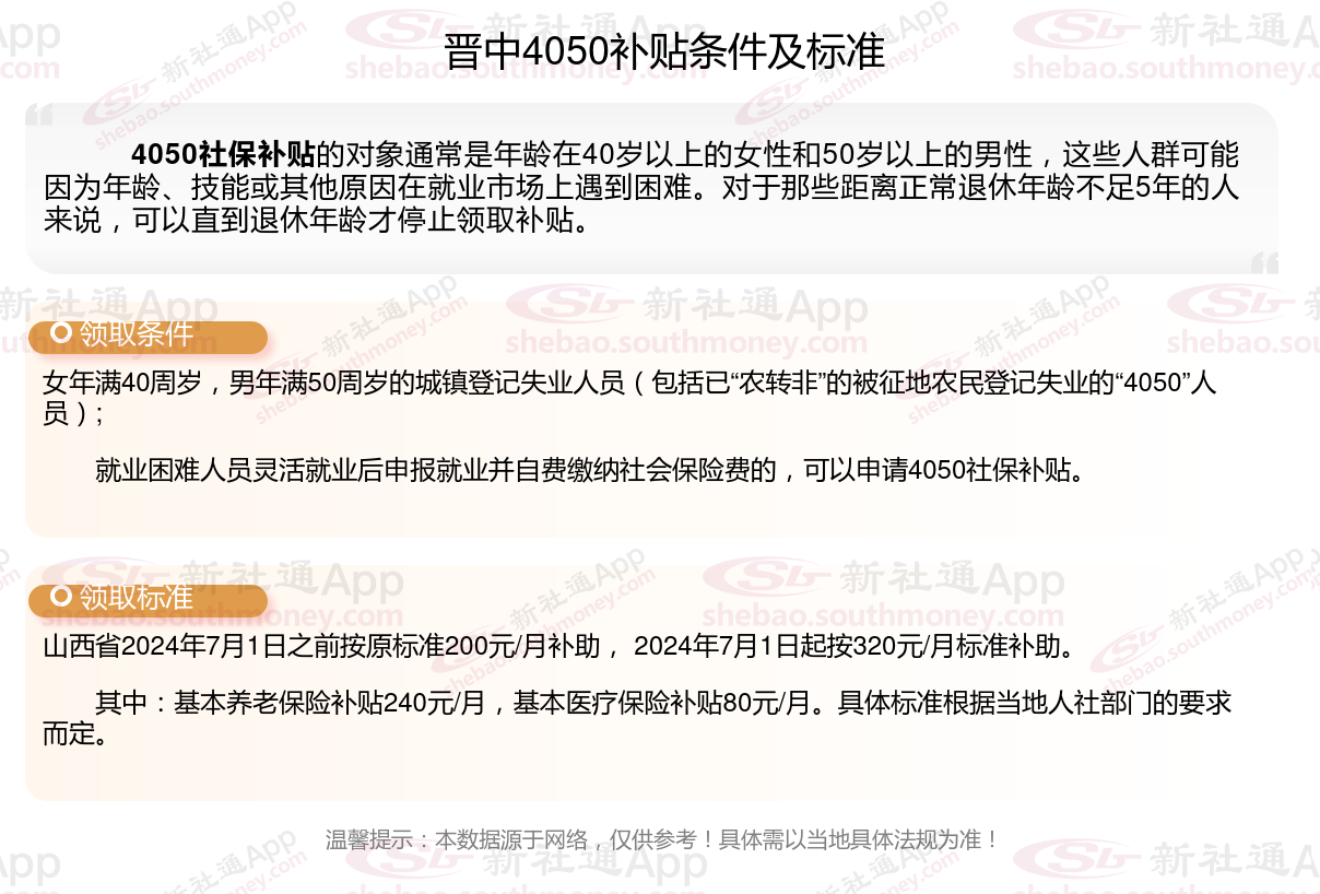2024晋中4050补贴主要针对的是年龄在40岁以上的女性和50岁以上的男性,这些人群通常因为年龄较大而面临就业困难。