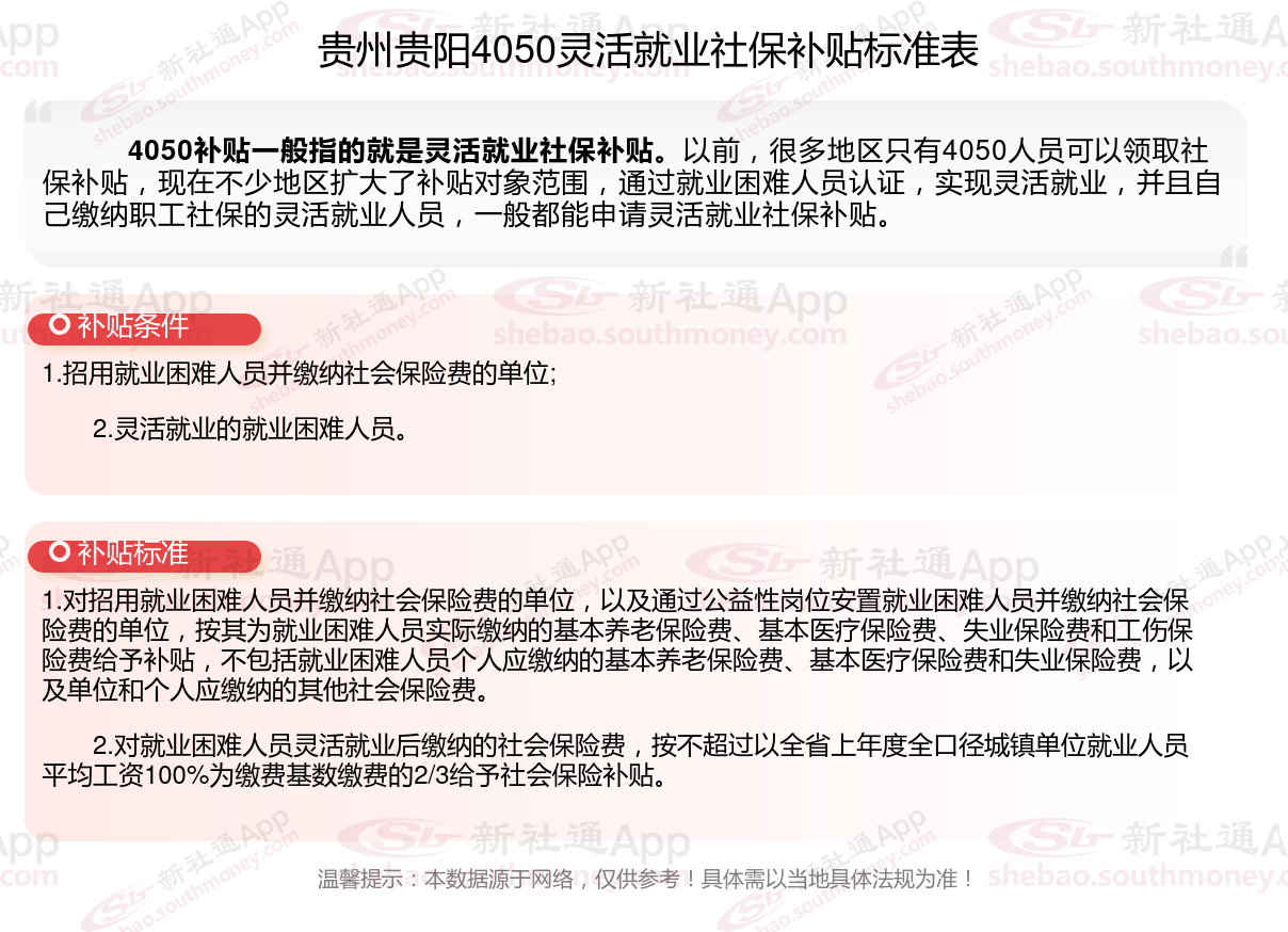 一、2023-2024年贵州贵阳灵活就业4050社保补贴标准和条件是什么