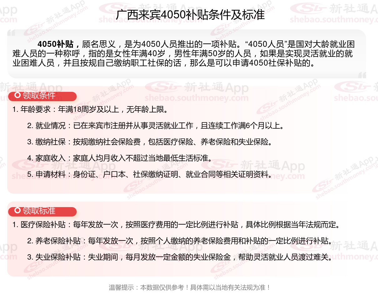 2024广西来宾灵活就业4050社保补贴是一项面向特定年龄段的就业困难人群的社会保险补贴。