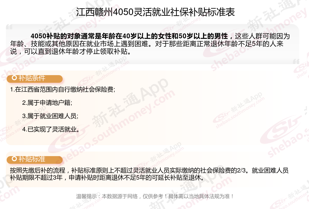 2024江西赣州灵活就业4050社保补贴是一项面向特定年龄段的就业困难人群的社会保险补贴。