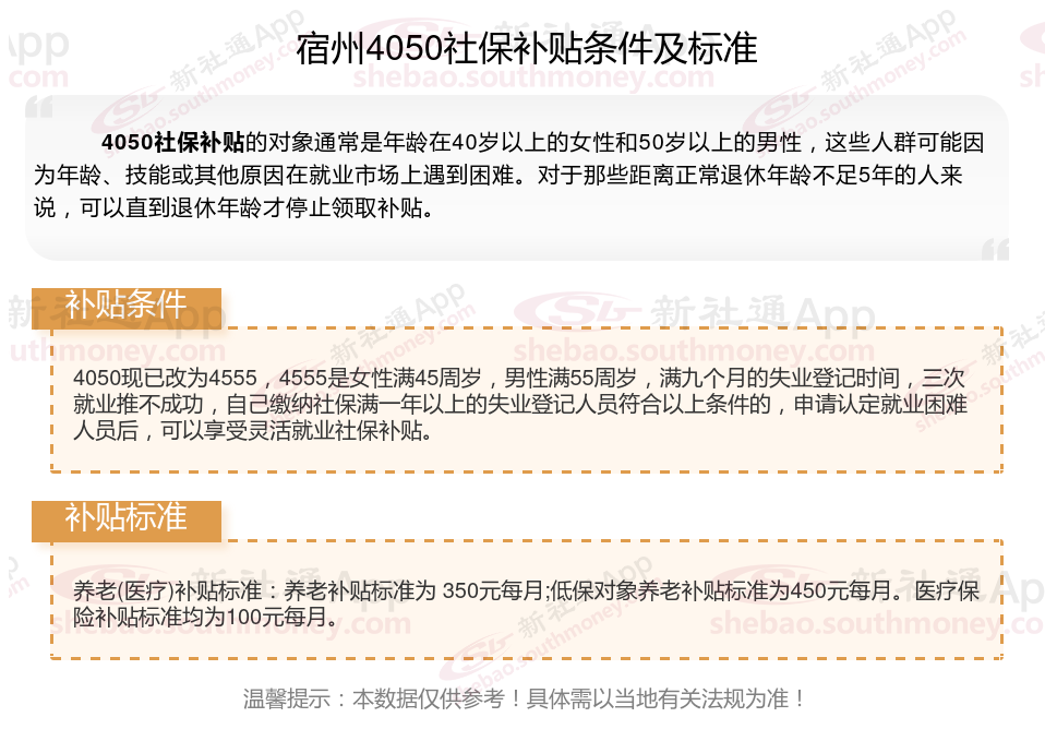 一、2023-2024年宿州4050社保补贴标准及条件,最新如下