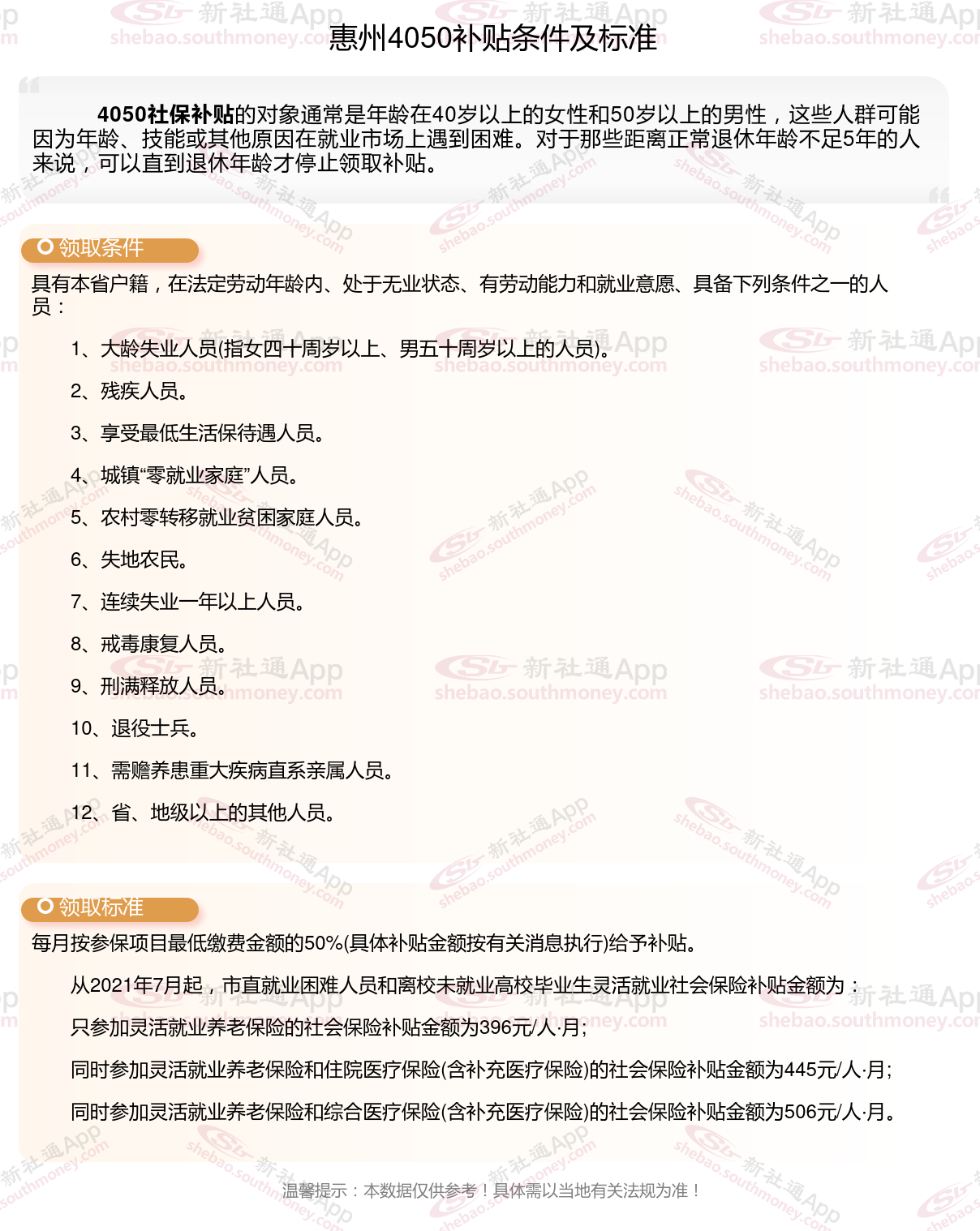 2024惠州4050补贴主要针对的是年龄在40岁以上的女性和50岁以上的男性,这些人群通常因为年龄较大而面临就业困难。