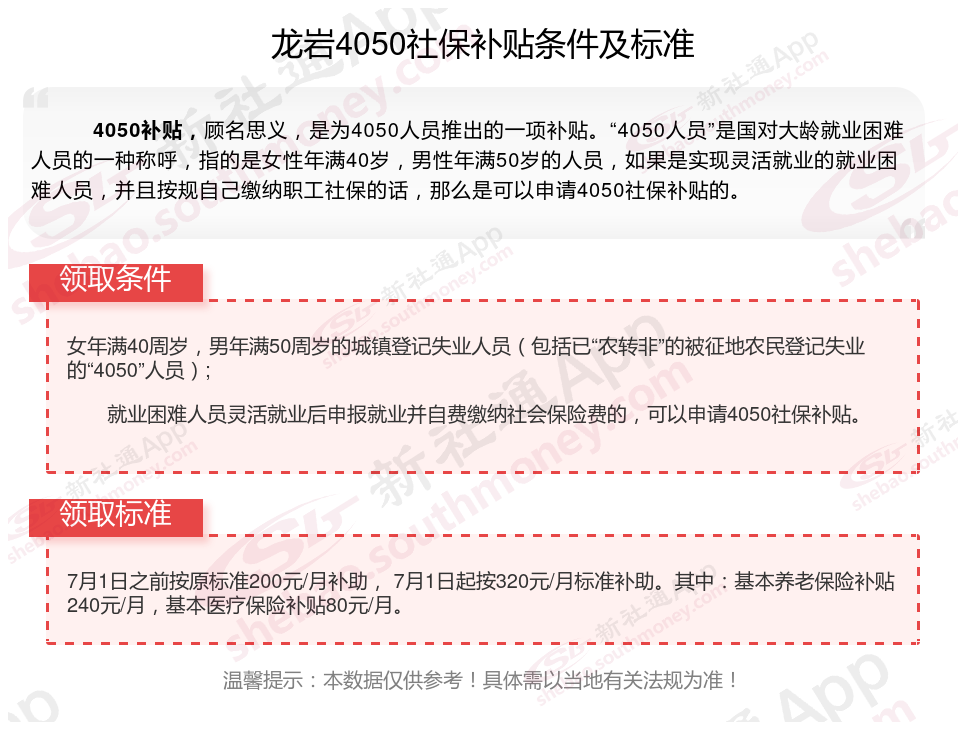 2024龙岩4050补贴主要针对的是年龄在40岁以上的女性和50岁以上的男性,这些人群通常因为年龄较大而面临就业困难。