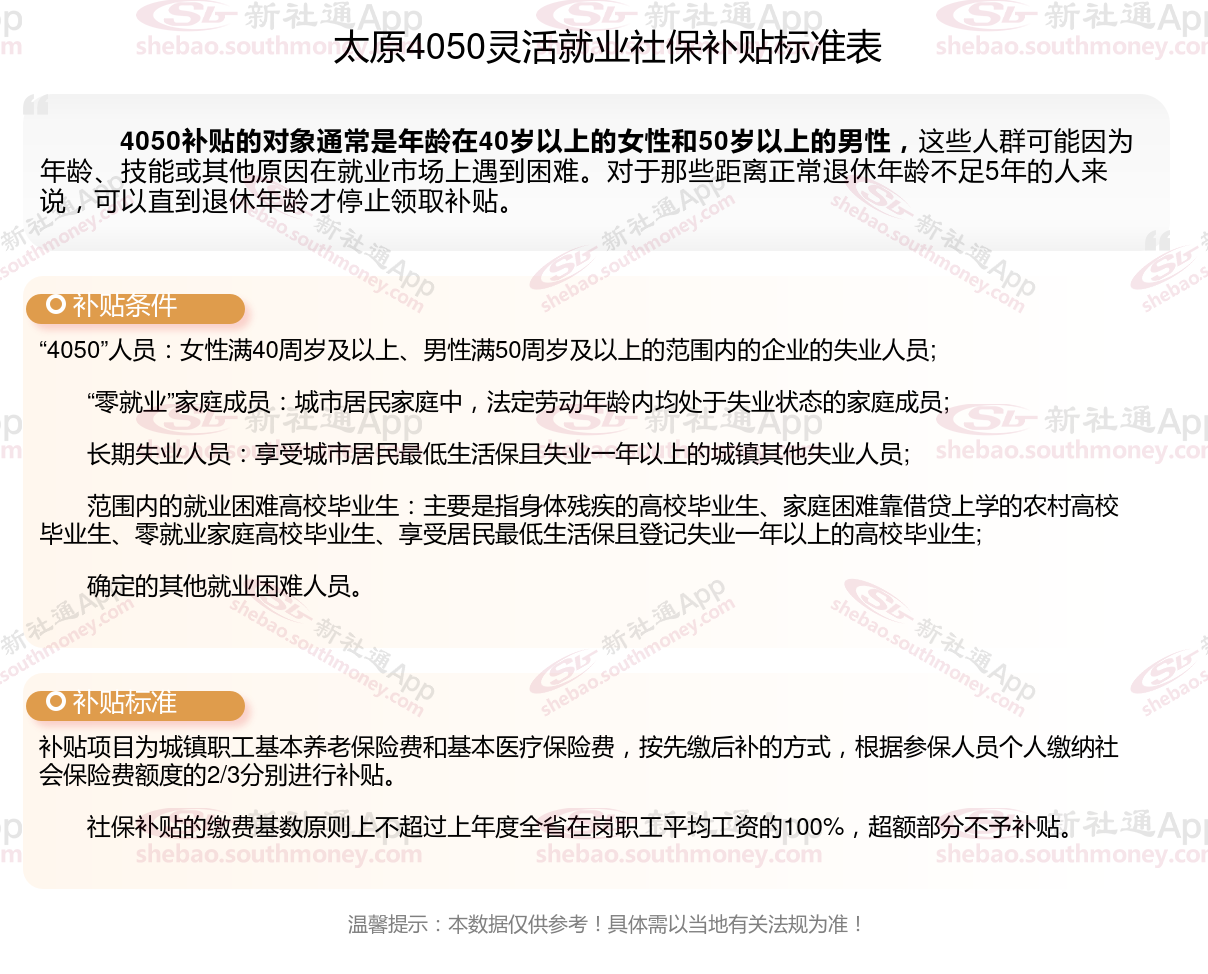 2024太原4050补贴主要针对的是年龄在40岁以上的女性和50岁以上的男性,这些人群通常因为年龄较大而面临就业困难。