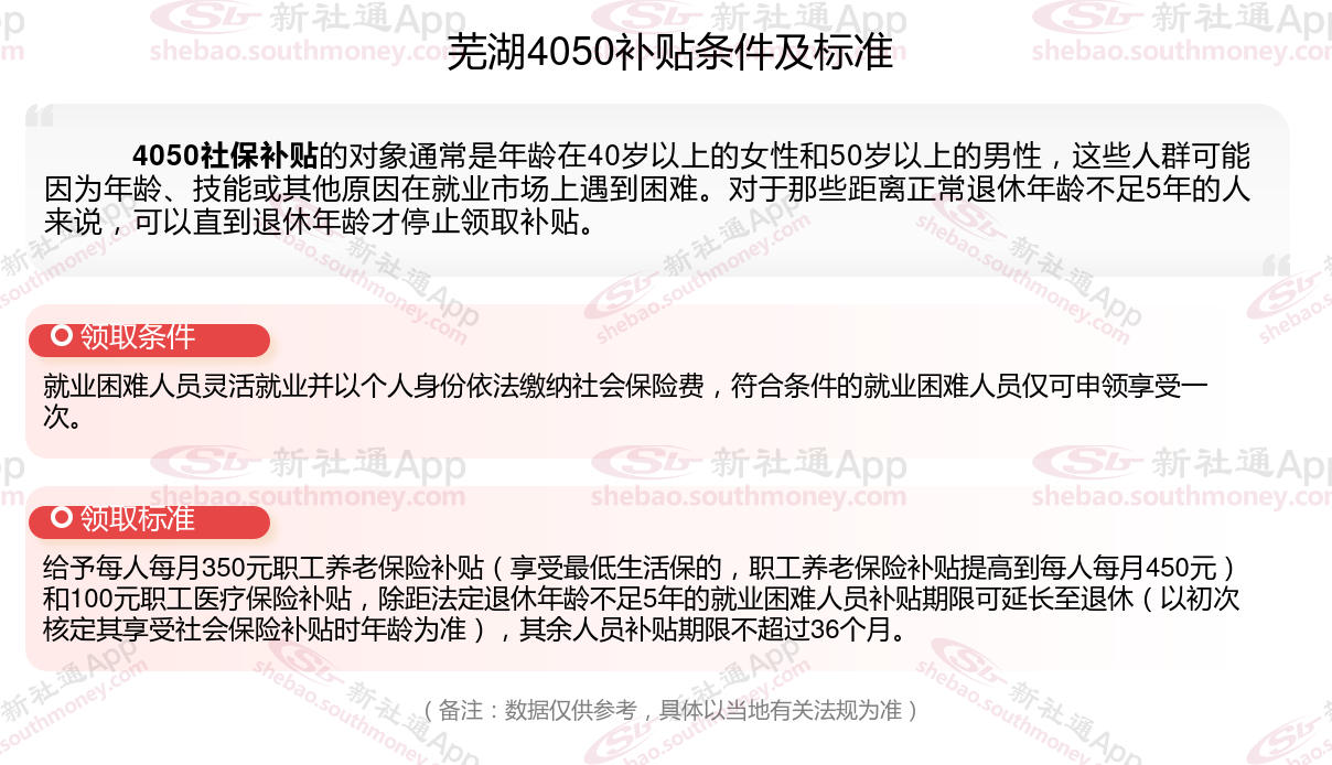 二、芜湖4050社保补贴标准及条件2023-2024年,最新如下