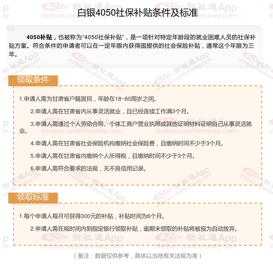 “4050人员”是国对大龄就业困难人员的一种称呼,指的是女性年满40岁,男性年满50岁的人员,那么白银4050灵活就业社保补贴标准是多少钱?白银4050社保补贴条件是什么?接下来随新社通APP小编了解一下最新资讯。