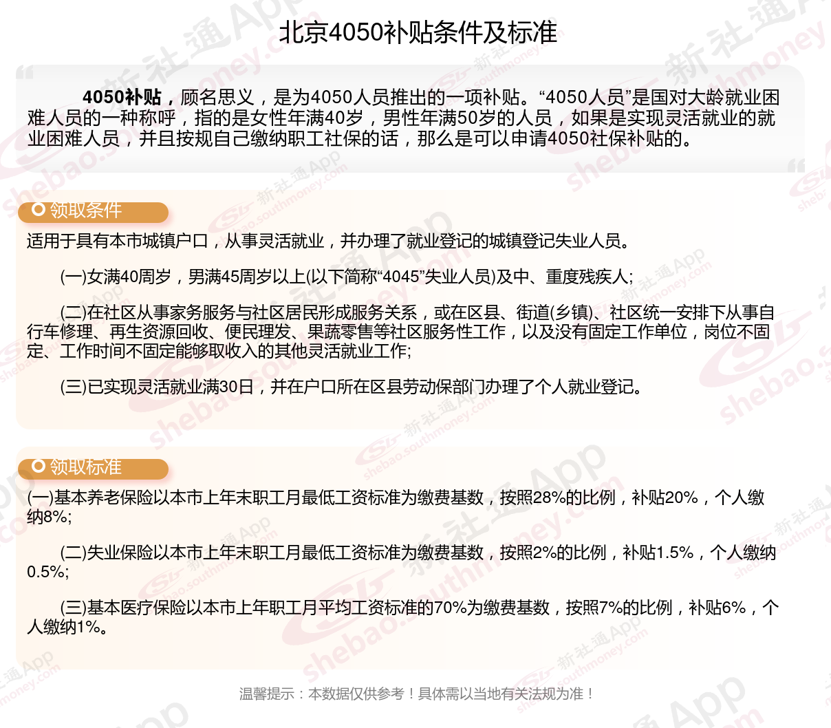 二、北京4050社保补贴标准及条件2023-2024年,最新如下