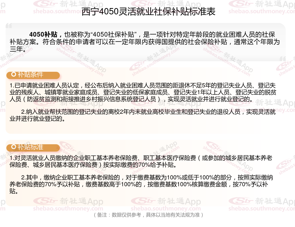 二、西宁灵活就业4050社保补贴标准及条件是什么