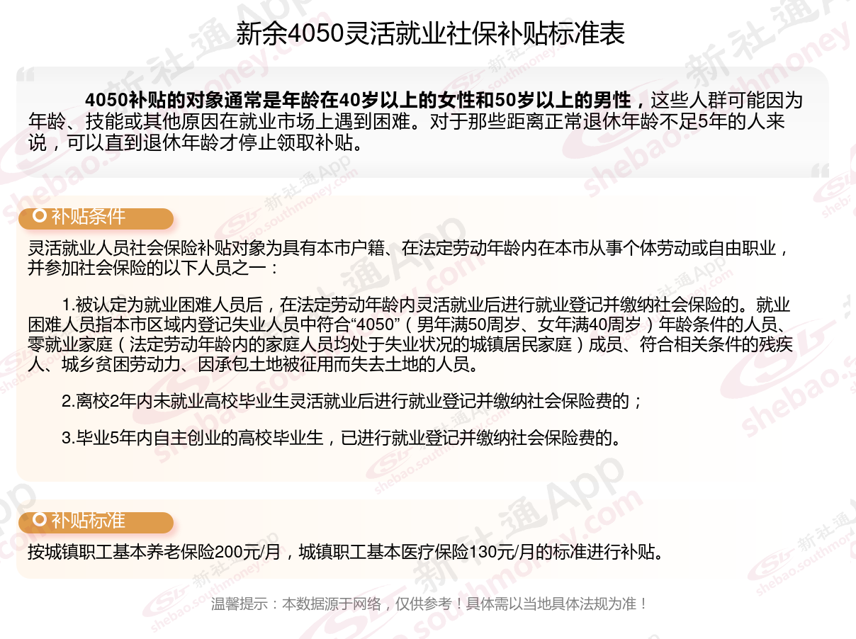 2024新余灵活就业4050社保补贴是一项面向特定年龄段的就业困难人群的社会保险补贴。