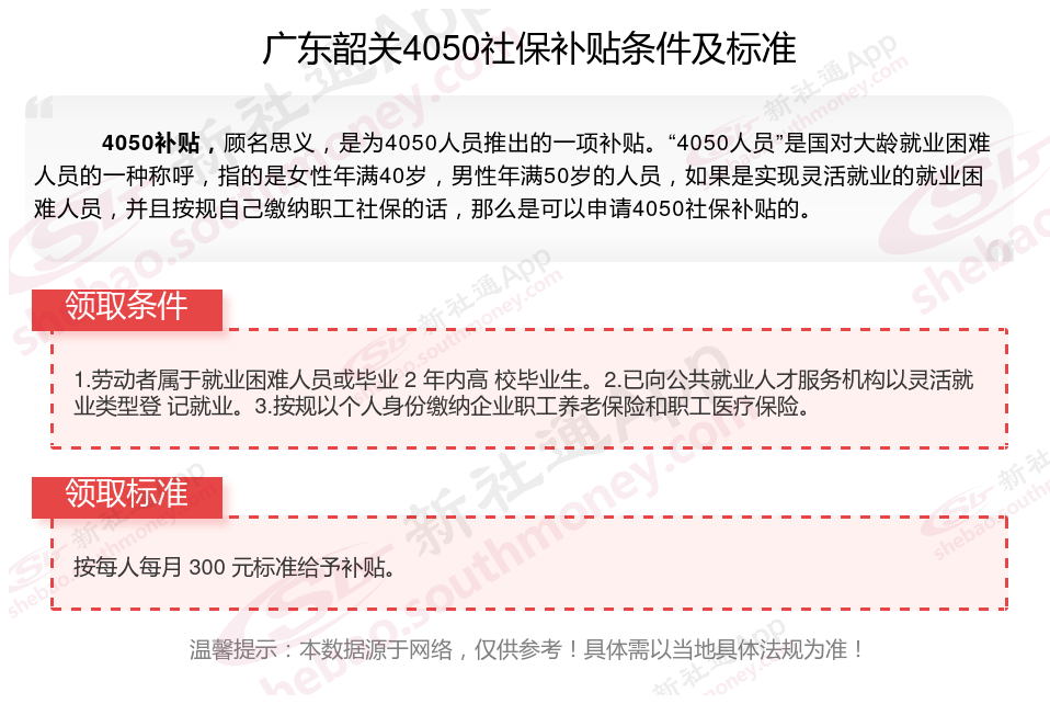2024广东韶关4050补贴主要针对的是年龄在40岁以上的女性和50岁以上的男性,这些人群通常因为年龄较大而面临就业困难。
