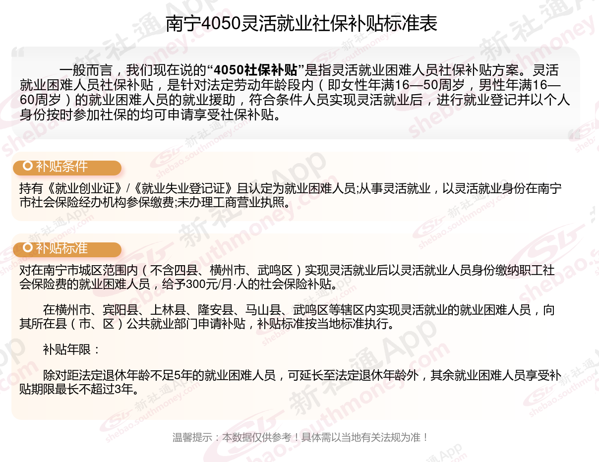 2024南宁4050补贴主要针对的是年龄在40岁以上的女性和50岁以上的男性,这些人群通常因为年龄较大而面临就业困难。