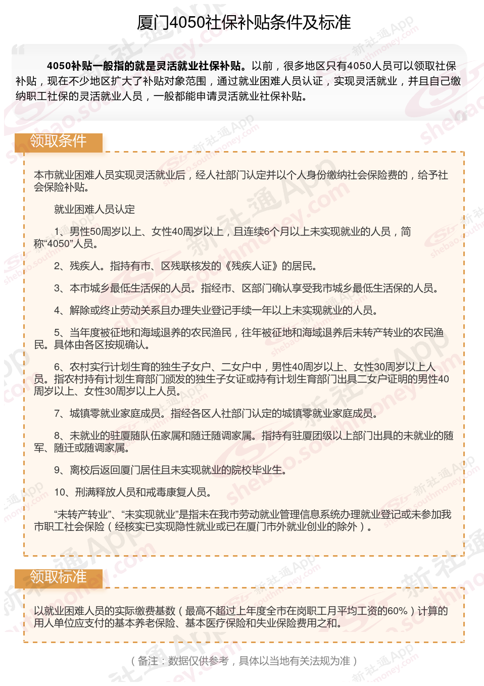 “灵活就业4050社保补贴”是指灵活就业困难人员社保补贴。该方案是对就业困难人员灵活就业后办理了就业登记手续并参加社会保险的,给予社会保险补贴。那么厦门4050灵活就业困难人员社保补贴标准是多少?厦门4050社保补贴需要符合什么条件?接下来随新社通APP小编了解一下最新资讯。
