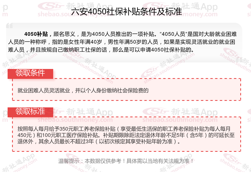2024六安4050补贴主要针对的是年龄在40岁以上的女性和50岁以上的男性,这些人群通常因为年龄较大而面临就业困难。