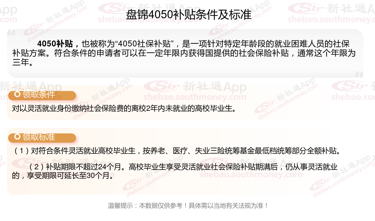 2024盘锦灵活就业4050社保补贴是一项面向特定年龄段的就业困难人群的社会保险补贴。