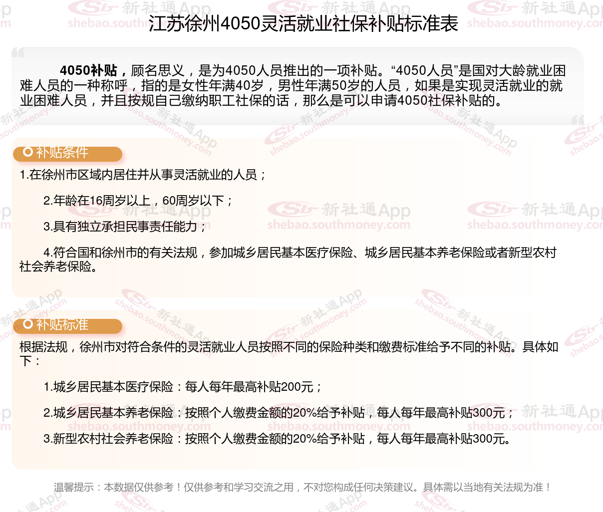 2024江苏徐州灵活就业4050社保补贴是一项面向特定年龄段的就业困难人群的社会保险补贴。