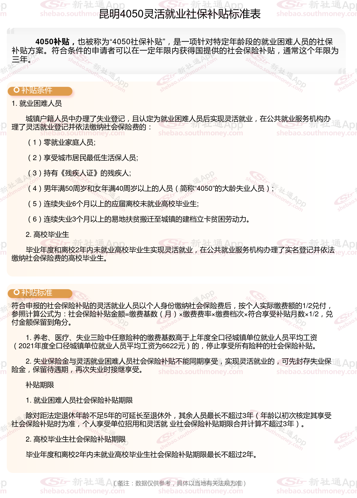 “4050人员”是国对大龄就业困难人员的一种称呼,指的是女性年满40岁,男性年满50岁的人员,那么昆明4050灵活就业社保补贴标准是多少钱?昆明4050社保补贴条件是什么?接下来随新社通APP小编了解一下最新资讯。