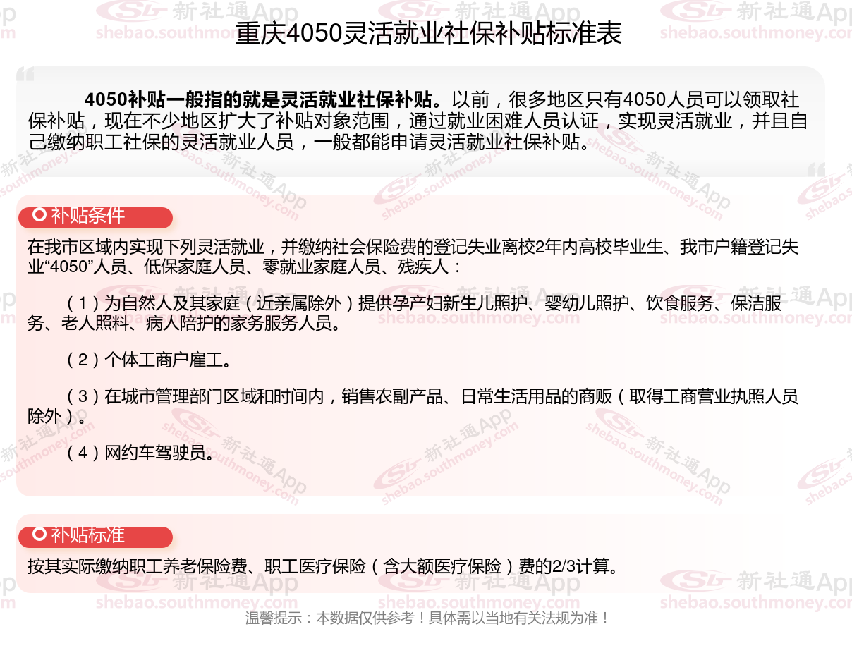 2024重庆灵活就业4050社保补贴是一项面向特定年龄段的就业困难人群的社会保险补贴。
