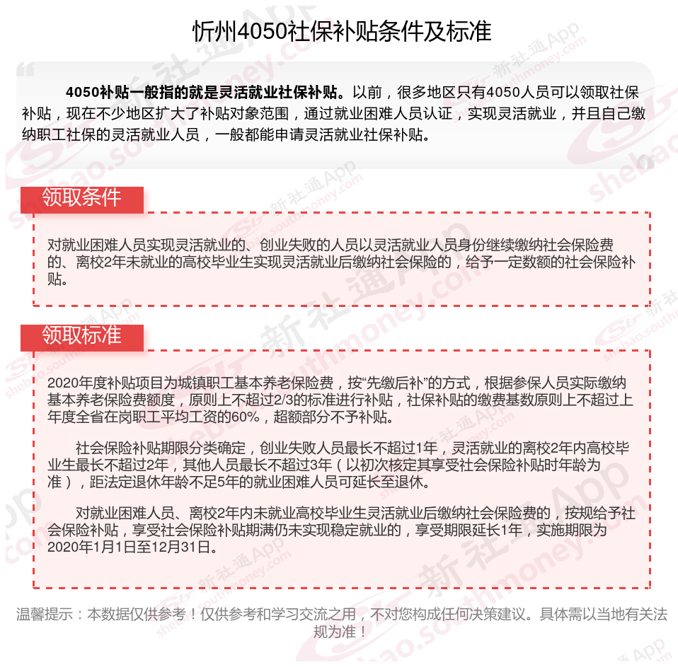 “4050人员”是国对大龄就业困难人员的一种称呼,指的是女性年满40岁,男性年满50岁的人员,那么忻州4050灵活就业社保补贴标准是多少钱?忻州4050社保补贴条件是什么?接下来随新社通APP小编了解一下最新资讯。