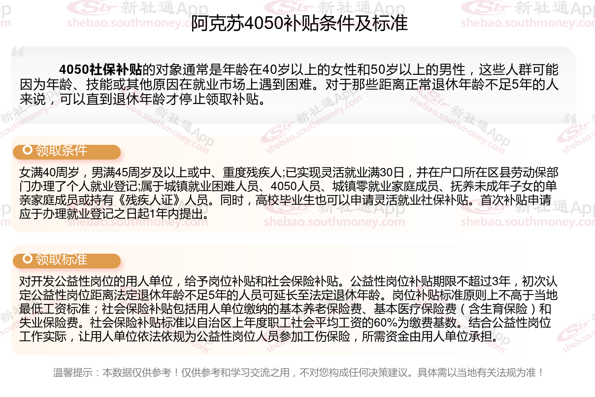 一、2023-2024年阿克苏4050社保补贴标准及条件,最新如下