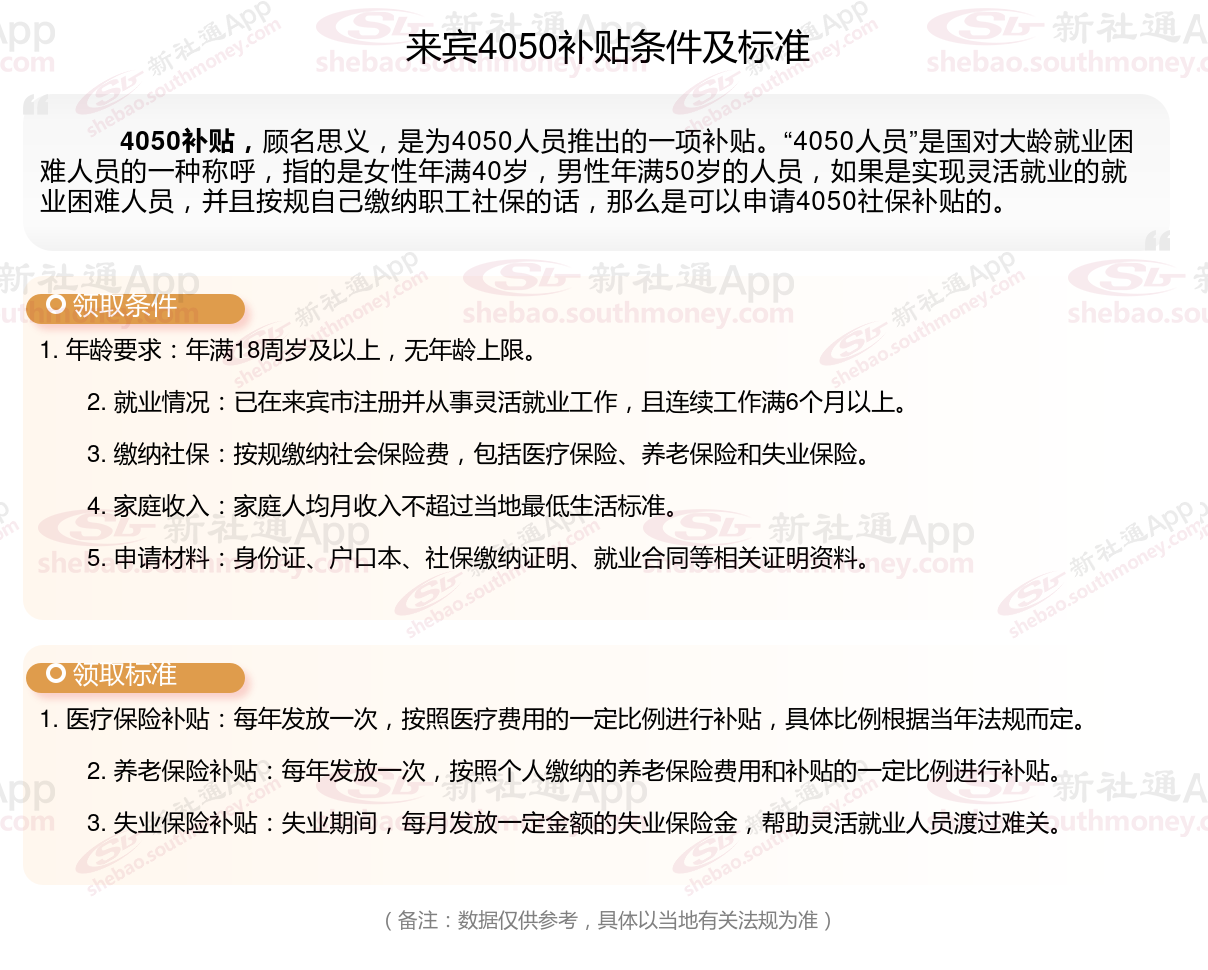 多数地区只有4050人员可以领取社保补贴,现在扩大了补贴对象及范围,通过就业困难人员认证,实现灵活就业,并且自己缴纳职工社保的灵活就业人员,一般都能申请灵活就业社保补贴。那么来宾4050灵活就业社保补贴标准是多少钱?来宾4050社保补贴条件是什么?接下来随新社通APP小编了解一下最新资讯。