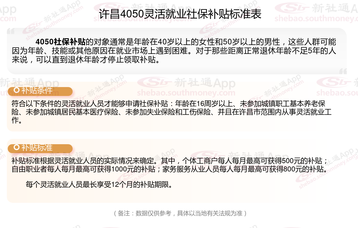 2024许昌4050补贴主要针对的是年龄在40岁以上的女性和50岁以上的男性,这些人群通常因为年龄较大而面临就业困难。