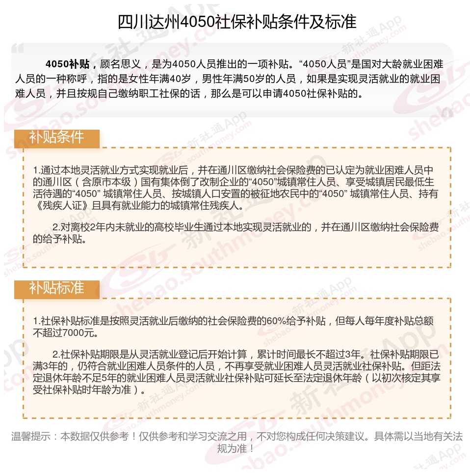 2024四川达州灵活就业4050社保补贴是一项面向特定年龄段的就业困难人群的社会保险补贴。