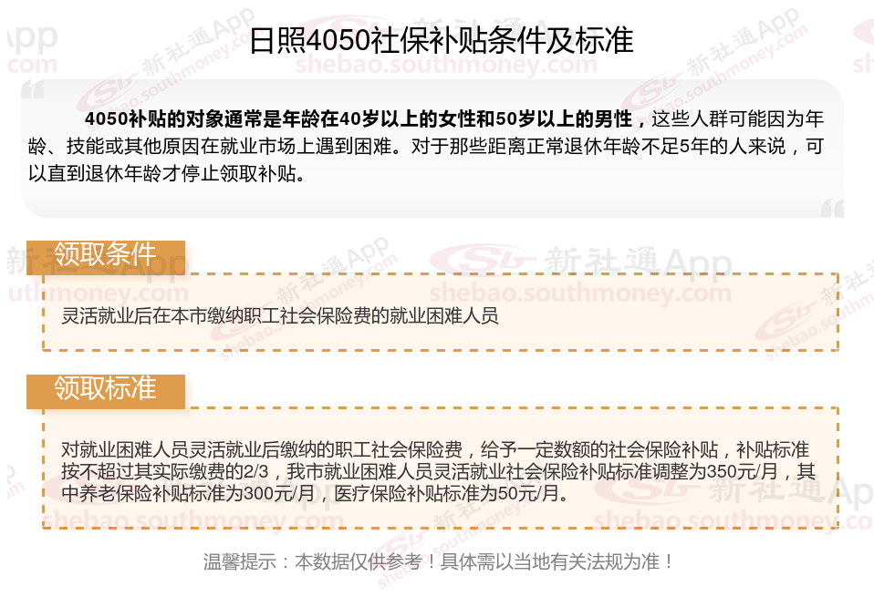 2024日照灵活就业4050社保补贴是一项面向特定年龄段的就业困难人群的社会保险补贴。
