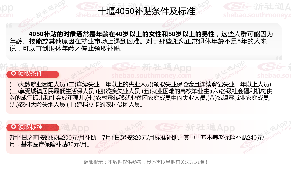 2024十堰4050补贴主要针对的是年龄在40岁以上的女性和50岁以上的男性,这些人群通常因为年龄较大而面临就业困难。