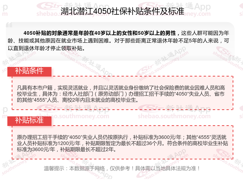 2024湖北潜江灵活就业4050社保补贴是一项面向特定年龄段的就业困难人群的社会保险补贴。