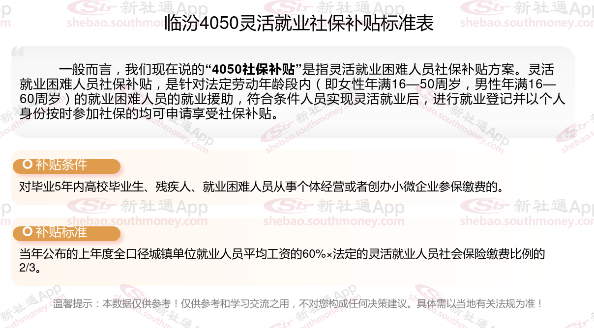 2024临汾灵活就业4050社保补贴是一项面向特定年龄段的就业困难人群的社会保险补贴。