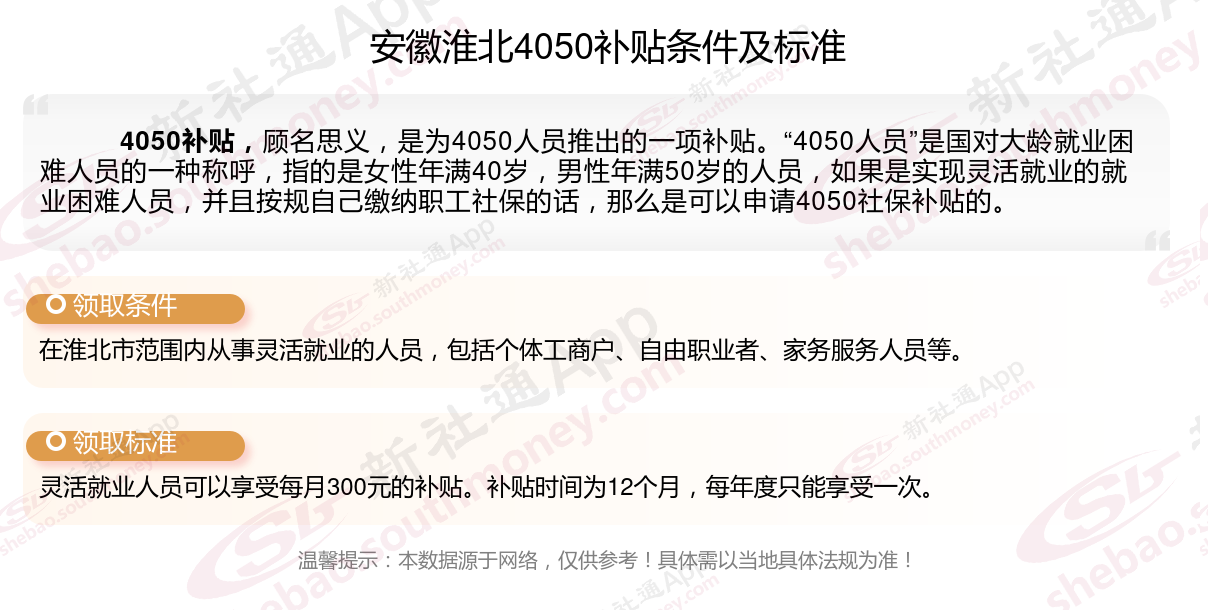 2024安徽淮北灵活就业4050社保补贴是一项面向特定年龄段的就业困难人群的社会保险补贴。