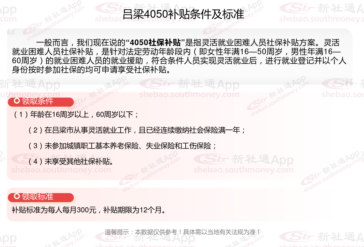 二、吕梁4050社保补贴标准及条件2023-2024年,最新如下