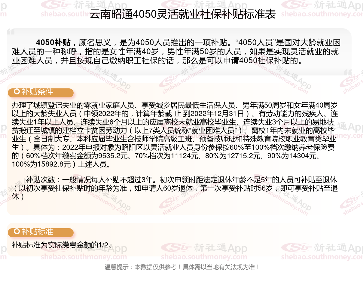 二、云南昭通4050社保补贴标准及条件2023-2024年